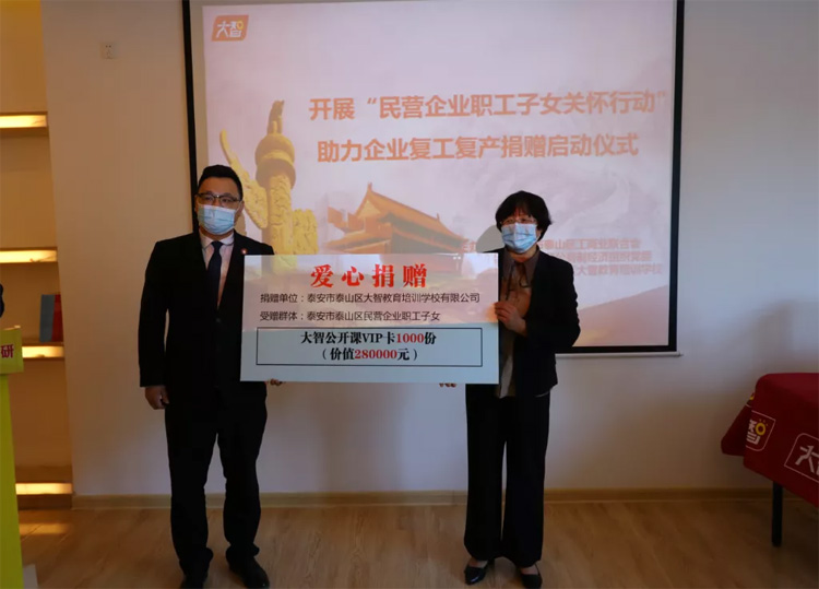 儀式上,大智泰安區(qū)域?yàn)樘┥絽^(qū)民營企業(yè)子女捐贈價(jià)值28萬元大智公開課。張玲一行對此次捐贈活動給予了高度認(rèn)可,對大智的社會責(zé)任擔(dān)當(dāng)給予高度贊揚(yáng)。泰山區(qū)組織部、泰安市電視臺對活動做專項(xiàng)報(bào)道。