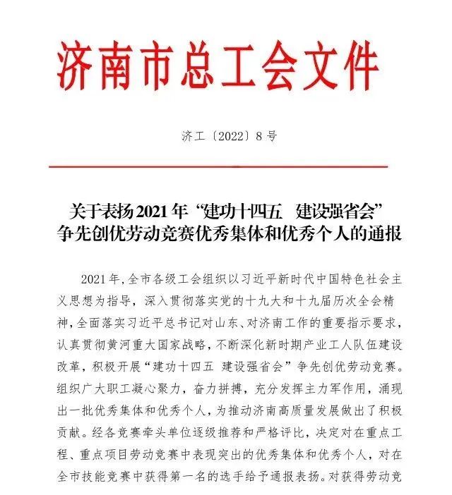 近日,濟南市總工會印發(fā)《關于表揚2021年“建功十四五 建設強省會”爭先創(chuàng)優(yōu)勞動競賽優(yōu)秀集體和優(yōu)秀個人的通報》,山東大智控股集團股份有限公司課程研究院榮獲2021年“建功十四五 建設強省會”爭先創(chuàng)優(yōu)勞動競賽一等獎。