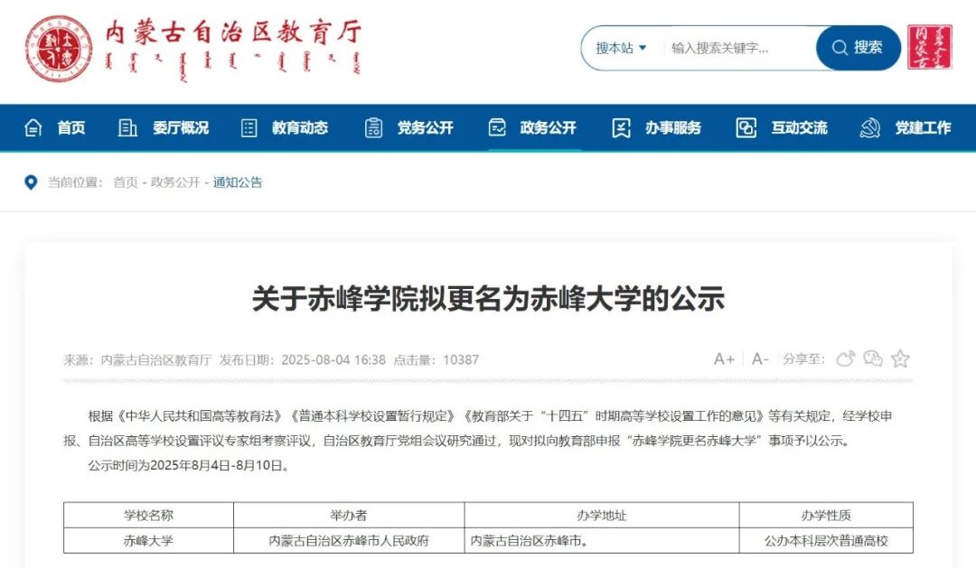 8月4日,內(nèi)蒙古自治區(qū)教育廳、浙江省教育廳發(fā)布高校更名公示,赤峰學(xué)院、紹興文理學(xué)院、湖州師范學(xué)院3所高校擬更名為赤峰大學(xué)、紹興大學(xué)、湖州師范...