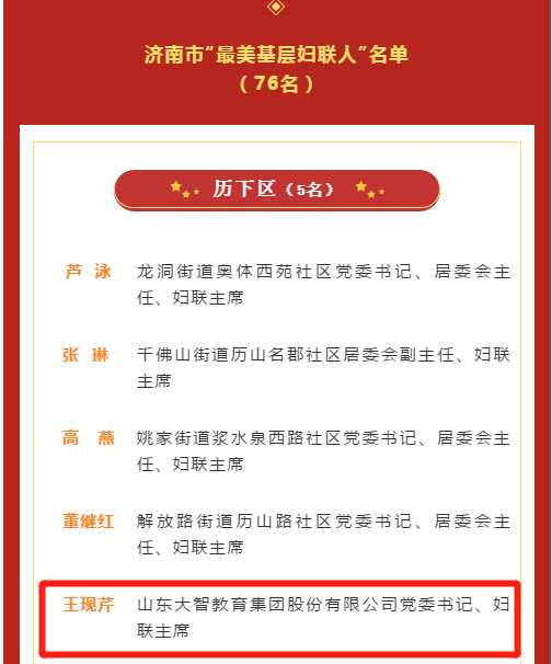近日,濟(jì)南市婦聯(lián)公布了“最美基層?jì)D聯(lián)人”名單,大智教育集團(tuán)黨委書(shū)記、婦聯(lián)主席王現(xiàn)芹被評(píng)為濟(jì)南市“最美基層?jì)D聯(lián)人”。