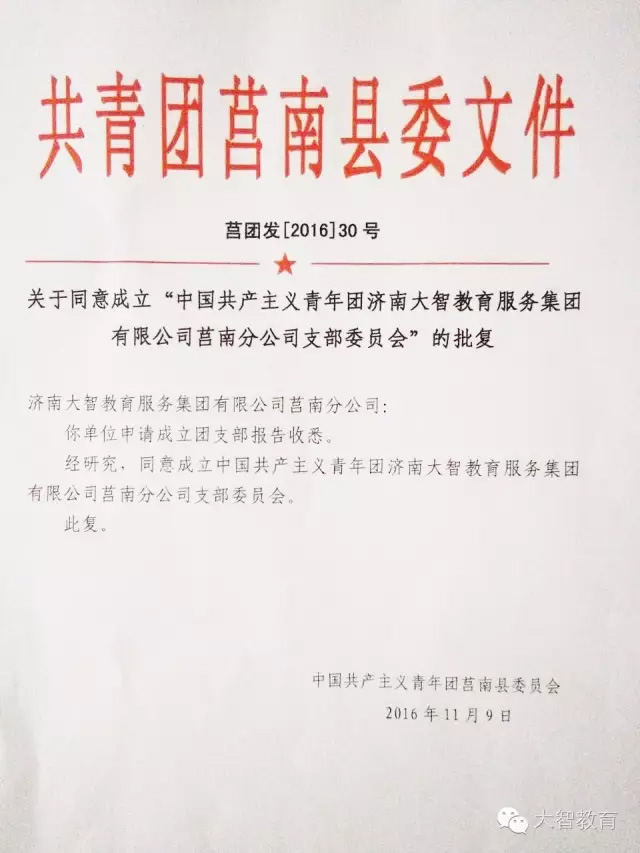 11月09日,中國(guó)共產(chǎn)主義青年團(tuán)莒南縣委員會(huì)正式批復(fù)同意成立“中國(guó)共產(chǎn)主義青年團(tuán)濟(jì)南大智教育服務(wù)集團(tuán)有限公司莒南分公司支部委員會(huì)”。莒南分公司團(tuán)支部是繼淄博、臨沂之后,大智成立的第三個(gè)區(qū)域團(tuán)支部,將對(duì)大智今后的發(fā)展及各項(xiàng)工作的開(kāi)展產(chǎn)生積極推動(dòng)作用。