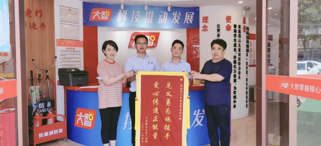 7月14日,一對父女來到泰安大智,將印有見義勇為施援手、愛心傳遞正能量的錦旗送到大智高中政治學(xué)科導(dǎo)師郭富祥手中,感謝他不顧自身安危,
